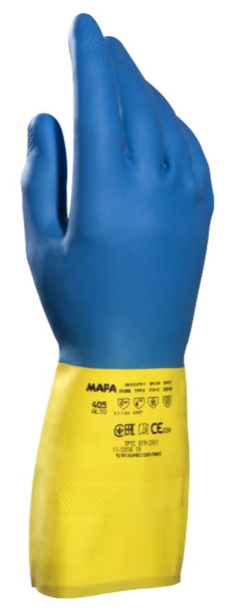 Luva de segurança confeccionada em látex natural e neoprene, acabamento interno em algodão flocado, antiderrapante na palma, face palmar e dedos. APROVADO PARA: proteção das mãos do usuário contra agentes abrasivos, escoriantes e cortantes e contra agentes químicos (álcoois primários (a), bases inorgânicas (k) e ácidos minerais Inorgânicos (l)).