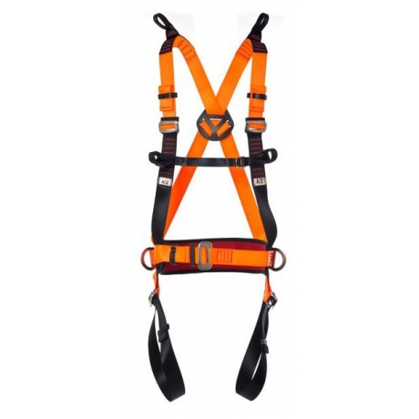 Cinturão de segurança tipo paraquedista/abdominal confeccionado em fita de poliéster multifilamentos de 45 mm e fita secundária de poliéster de 25 mm. Possui seis pontos de conexão, sendo um ponto peitoral por meio de duas alças para engate simultâneo de ancoragem em poliéster, uma meia argola dorsal em aço, duas alças de suspensão para espaço confinado em poliéster e duas meias argolas laterais de aço como ponto de conexão para posicionamento na cintura. Possui cinco fivelas duplas em aço, sendo duas para regulagem peitoral, duas para regulagem das coxas e uma para regulagem na cintura. Possui porta ferramentas em fita de poliéster na cintura. Com almofada na cintura, altura de 110 mm e 750 mm de comprimento.