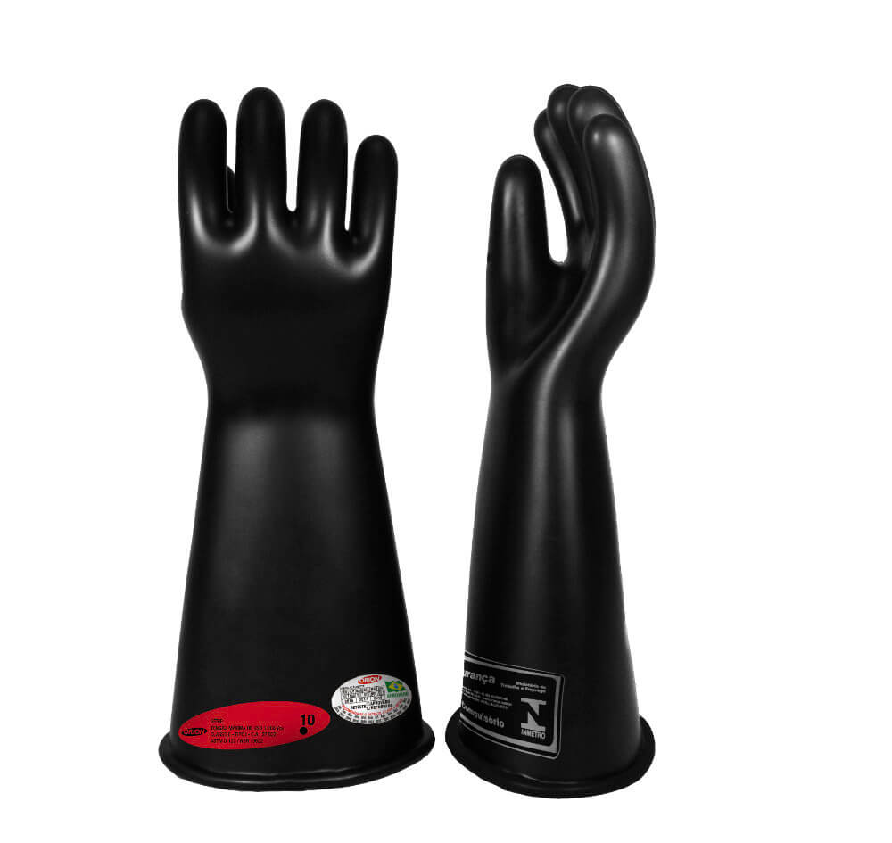 Luva Isolante fabricada de borracha natural/sintética, tipo II - classe 3, comprimento 406 mm, tensão de uso 26500V. “ESTE EQUIPAMENTO DEVERÁ APRESENTAR O SELO DE MARCAÇÃO DO INMETRO”. Aprovado Para: PROTEÇÃO DAS MÃOS DO USUÁRIO CONTRA CHOQUES ELÉTRICOS. TENSÃO MÁXIMA DE USO CLASSE 3: 26500V.