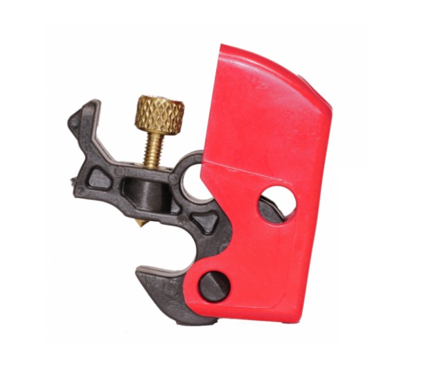 Dispositivo com capa de plástico ABS vermelho e base de Nylon rígido preto Parafuso de latão de fixação manual, sem necessidade de chave de fenda Orifício para colocação do cadeado frontal ou lateralmente Atende manoplas com dimensões de até 8mm largura x 13mm comprimento x 54 mm Altura