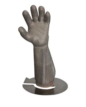 Luva de segurança confeccionada em malha de aço inoxidável, fio com diâmetro de 0,55 mm e anéis com diâmetro interno de 2,9 mm e externo de 4,0 mm com pulseira malha aço inox para fechamento e ajuste no punho, cinco dedos, punho 21 cm.