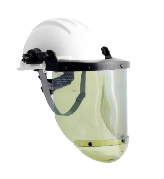 Conjunto Protetor facial para uso contra arco elétrico atendendo integralmente a NR-10, equipamento composto de visor confeccionado em policarbonato verde musgo, o qual permite o reconhecimento de cores e sinais de trânsito, sendo o mesmo fixado a um suporte basculante confeccionado em polímero na cor preta em forma de arco por meio de cinco pinos de polímero preto dispostos na parte frontal e nas laterais, queixeira disponível em duas opções, sendo em polietileno preto ou em policarbonato verde musgo no mesmo tom do visor, fixada à parte inferior do visor por meio de três pinos em polímero preto. O suporte é acoplado ao capacete através de encaixe nas fendas laterais do casco. Protetor facial para uso com o capacete de segurança CA nº 14.712. - Aplicação do Produto: :: Para uso em locais com possibilidade de ocorrência de arco elétrico como plantas elétricas, aberturas de painéis, linhas aéreas, cabines primárias ou qualquer outro ambiente com características similares. - Especificações Técnicas: :: Modelo: 158 ARC - NR10; :: Visor Confeccionado Em Policarbonato Verde Musgo; :: Proteção contra choques elétricos e agentes térmicos provinientes do arco elétrico; :: Proteção contra Alto Impacto (" +" ); :: Proteção contra Radiação Ultravioleta ("U6"); :: Filtro de Luz Visível ("L2"); :: Filtro contraradiação infravermelha ("R4").
